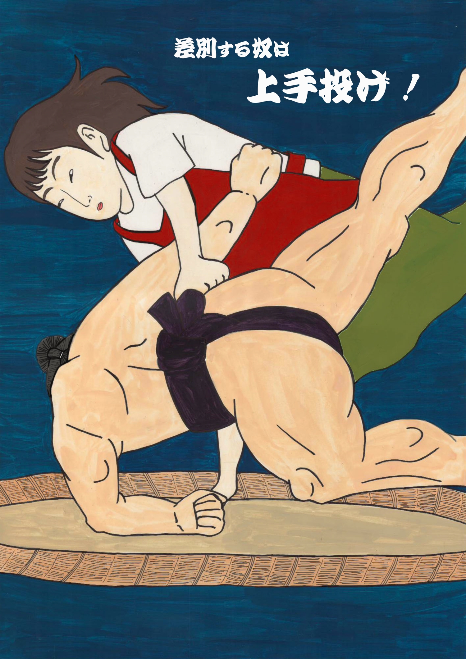 大相撲においてのスポーツ性差別問題をテーマに制作しました。 浮世絵の雰囲気で女性が力士を上手投げしているインパクトのあるポスターに仕上げました。 相撲に絡めたキャッチコピーにして全体の統一感を出しました。