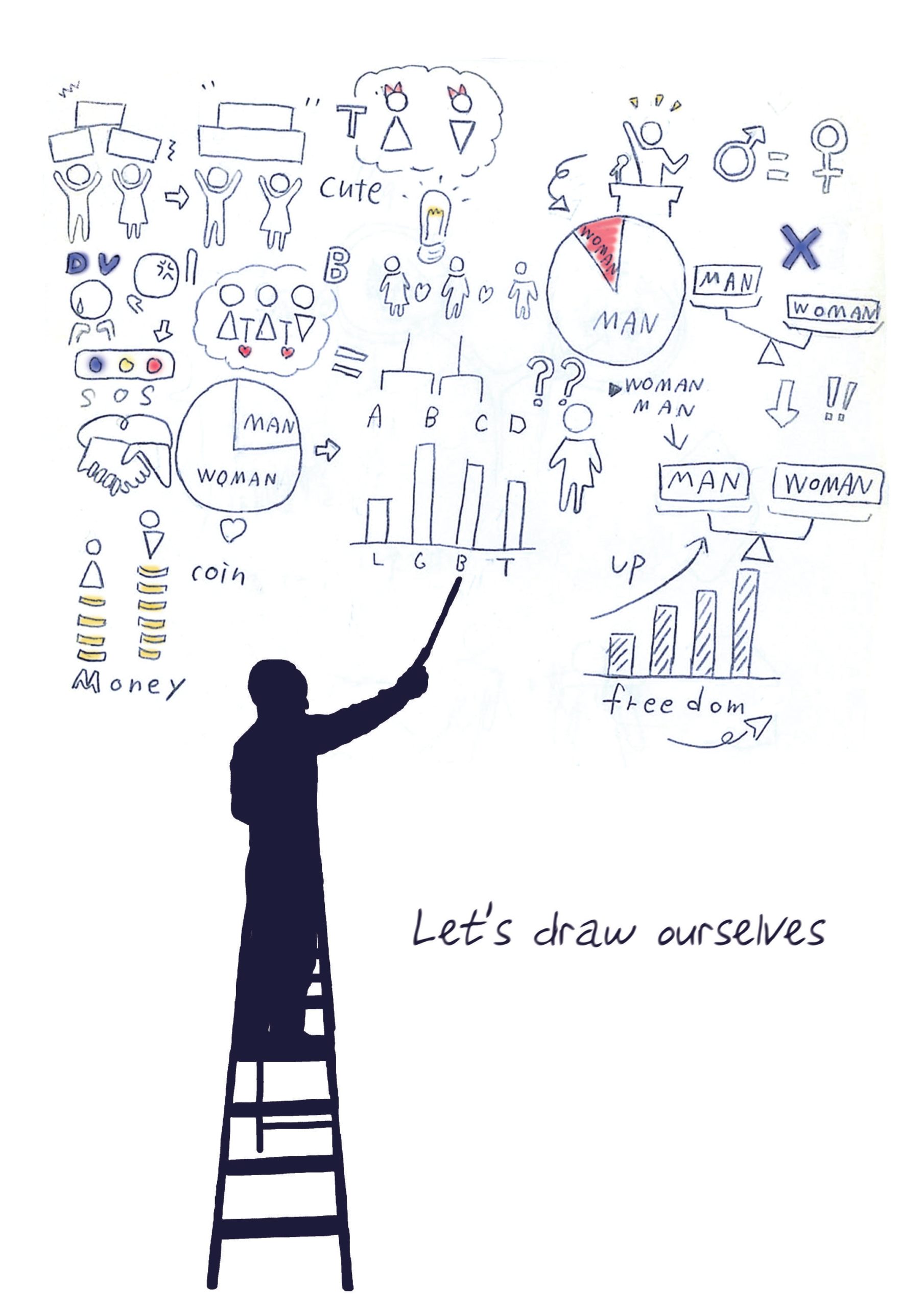 男女共同参画についてブレインストーミングをしているイメージで制作しました。 自分たちで男女が平等に生きていける未来を描いていけるような社会になればいいなという気持ちを表現しました。 余白を多めにすることでシンプルに伝えたいことをわかりやすくしました。
