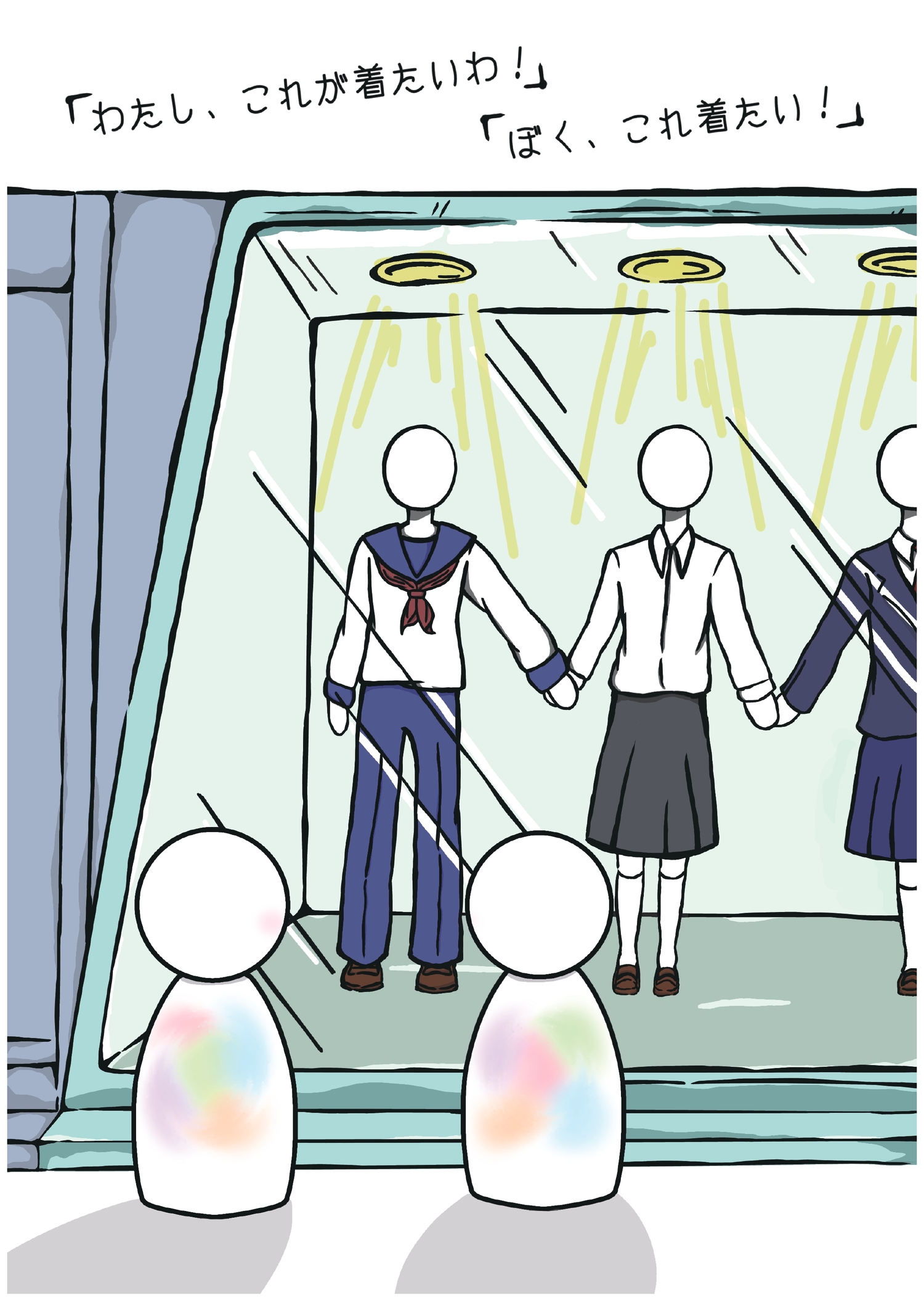 『学校の制服』をテーマにして制作しました。 制服を着る時に違和感があったり、自分が着たい服を自由に着られないことはすごく悩むと思います。少しでも共感・理解を深めてもらい、誰もが自由に幸せに過ごしてほしいという願いも込めました。