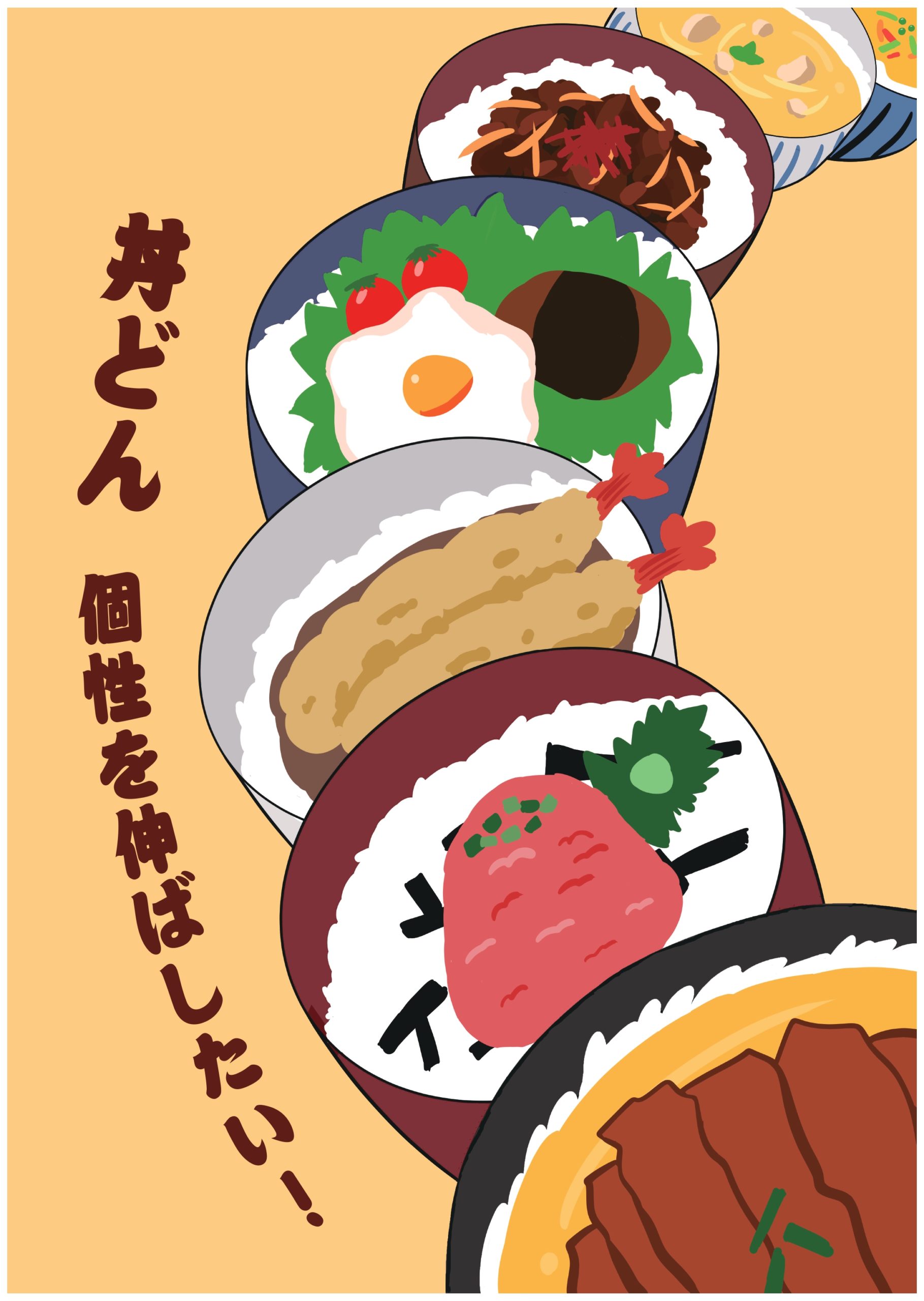 ・人の個性を丼ものに見立てて、個性は人それぞれなので丼の中を全部違うものにしました。 ・キャッチコピーは「どんどん」と「丼物」をかけました。また、「伸ばしたい」なので丼ぶりが上に向かっている感じにしました。
