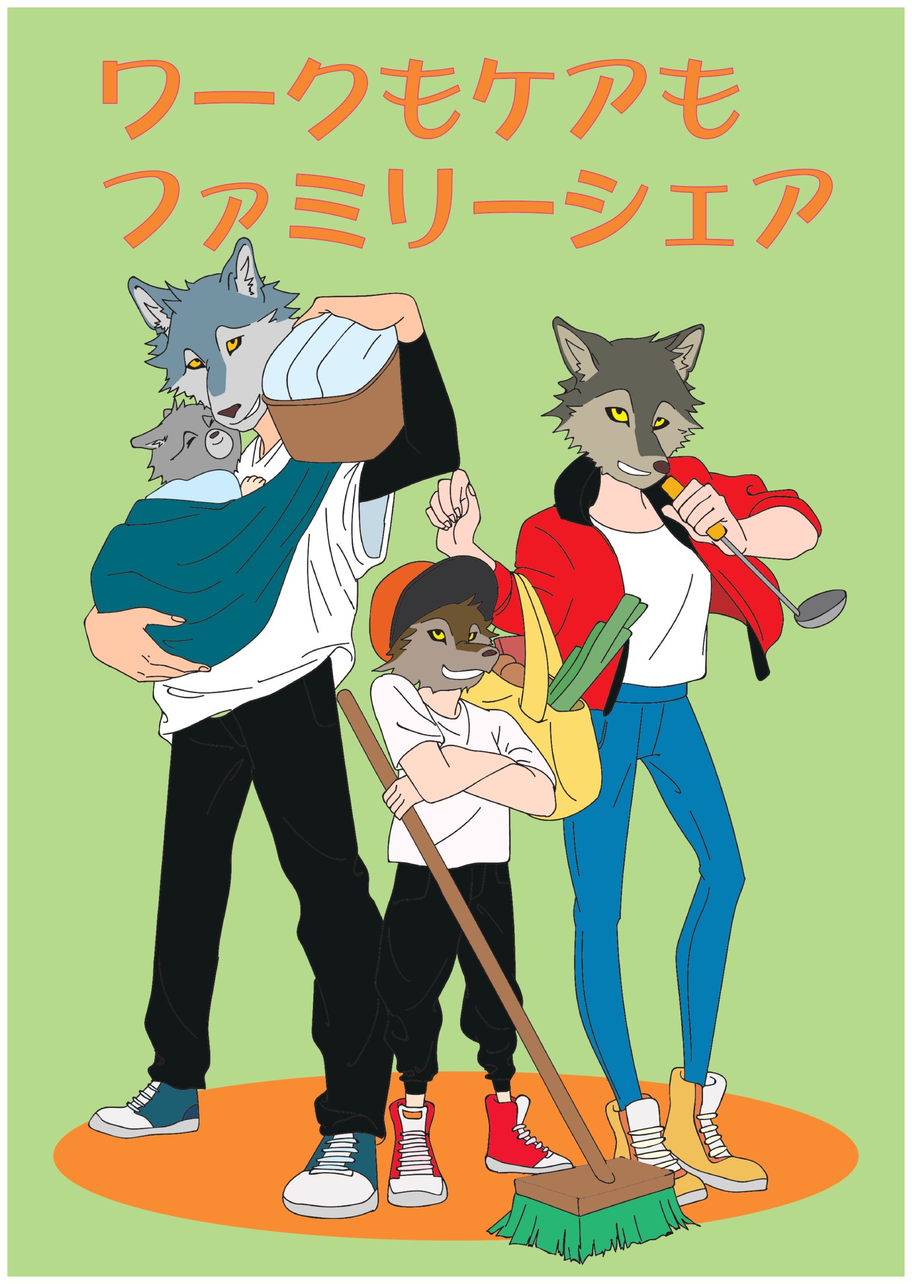 母が家事育児、父が仕事というように決めつけずに、家族みんなでやろうということを表現しました。 キャッチコピーは、「ワーク(仕事)もケア(家事育児)もファミリーシェア(家族で共有)」という意味です。 顔を狼にしたのは、狼は仲間や家族を大切にして、子育てなどは家族だけでなく仲間も一緒にするというのを知ったからです。
