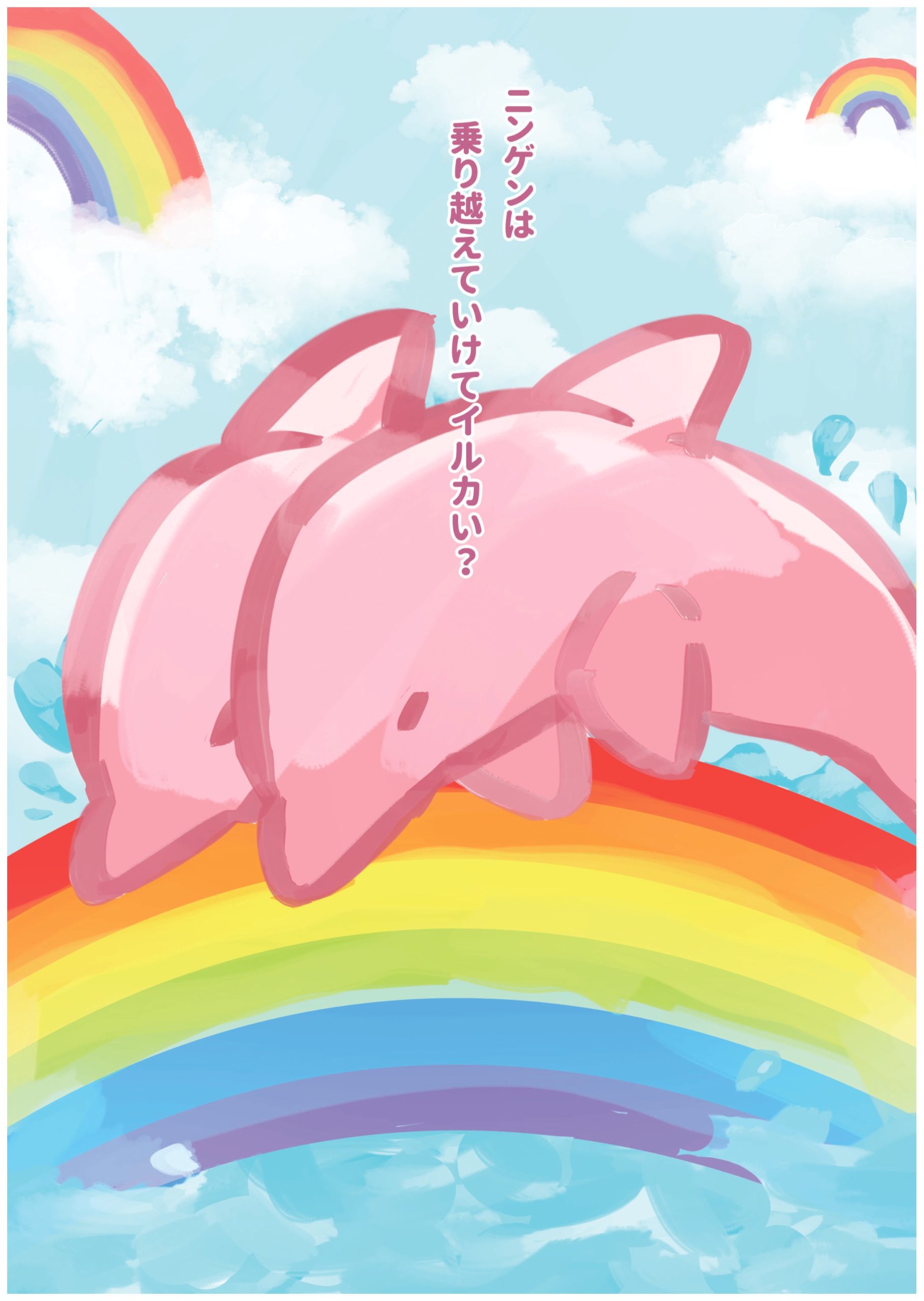 同性愛やLGBTなどにまだ偏見がある人間に対し、性別関係なく番を決めるイルカがLGBTの象徴である虹を乗り越えている様子を描きました。 「性別の壁を乗り越えていけているか」という言葉を「イルカ」とかけてシャレを交えつつ、見た人が何か考えてくれる様問いかけるキャッチコピーにしました。