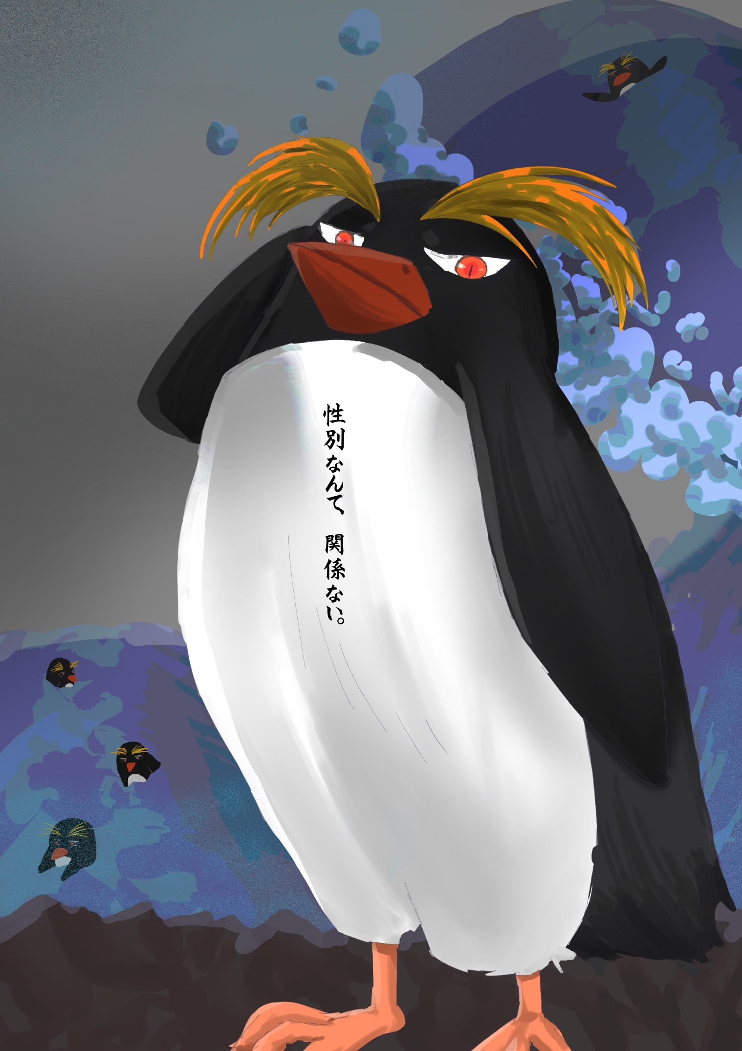 人間の恰好も男女関係なく好きな恰好をすればいいと思ったので、雄雌で姿の変化がないトビイワペンギンを描きました。 恰好に関して人が傷くことを言われるのは許されないとおもったので、強めの雰囲気の絵に仕上げました。