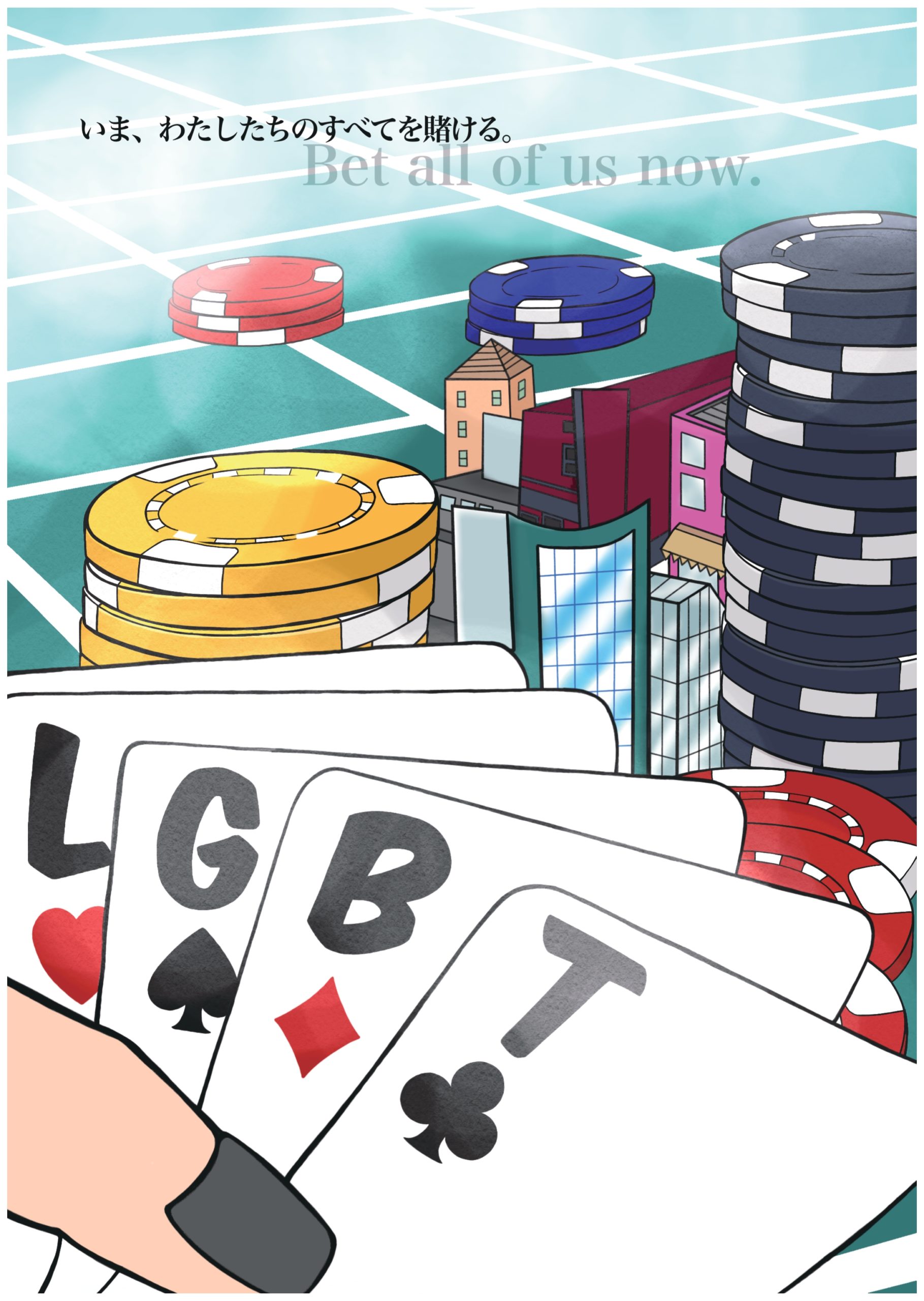 LGBTとギャンブルをかけたポスターを制作しました。 ビルなどの建物を紛れ込ませて、チップに見立てました。 私たちの生活や暮らしを全て賭けられるほどのものだ、ということを伝えたくてこのデザインにしました。