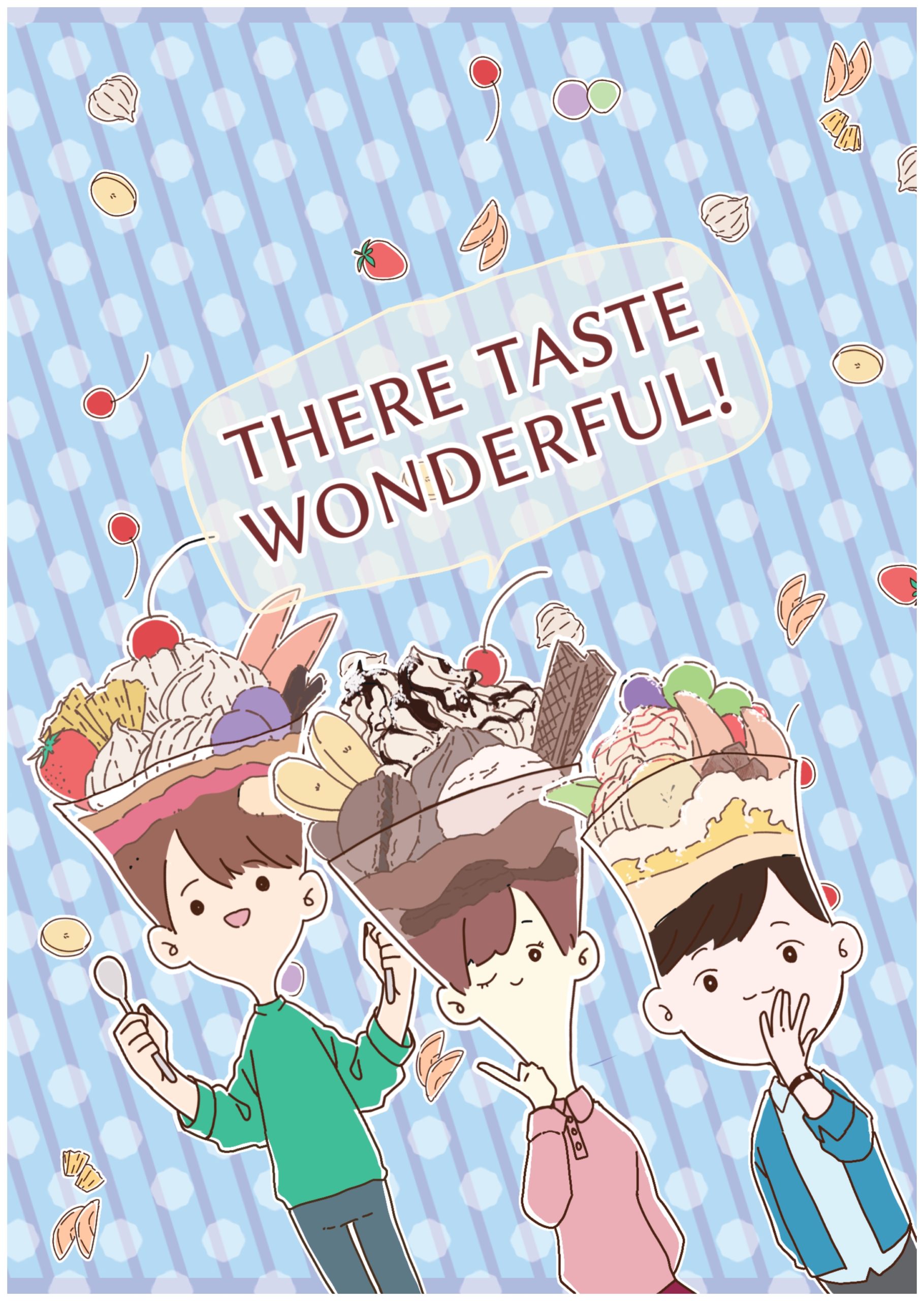 「自由な髪形」というテーマで描きました。髪形をたくさんの種類があるパフェに例えたら面白いんじゃないかという発想のもと、三人のキャラクターの頭にそれぞれちがう種類のパフェをのせて、違いがわかりやすくなるようにしました。 「どのパフェも美味しい」つまり「誰がどんな髪型も素敵」という意味を含んだキャッチコピーにしました。