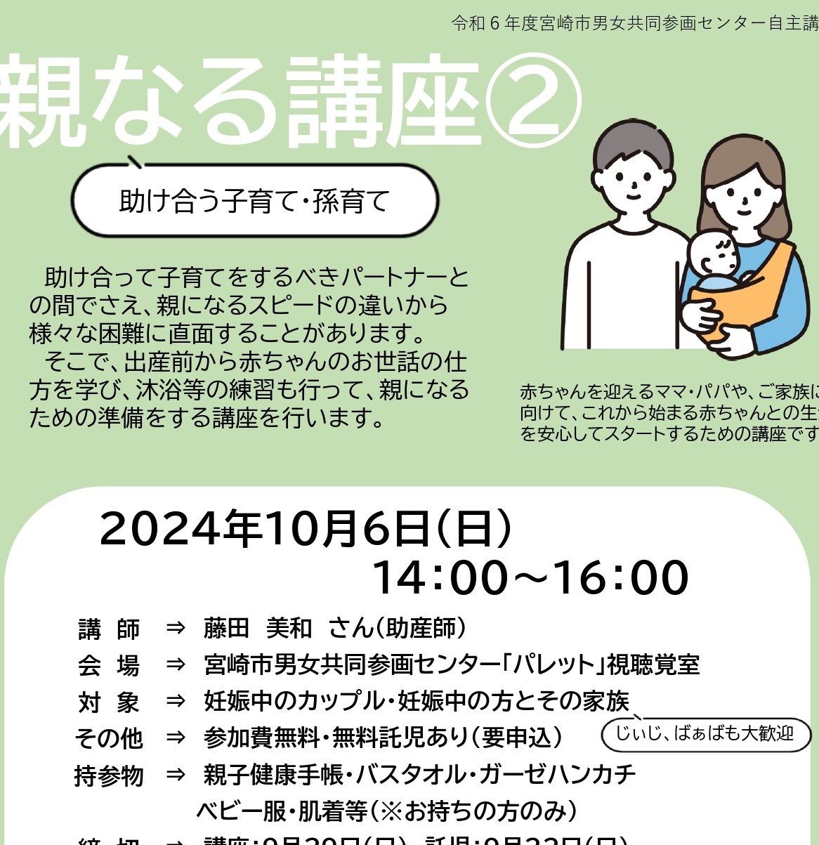 そこで、出産前から赤ちゃんのお世話の仕方を学び、沐浴等の練習も行って、親になるための準備をする講座を行います。