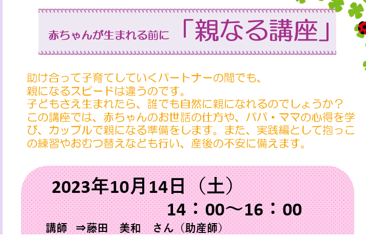 この講座では、出産前から産後の心と体の変化の仕組み、パートナーの関係性の変化、コミュニケーションスキルなどを学び、ふたりで親になる準備をします。また、実践編として抱っこやおむつ替え、沐浴等の練習も行い、産前産後の不安に備えます。
