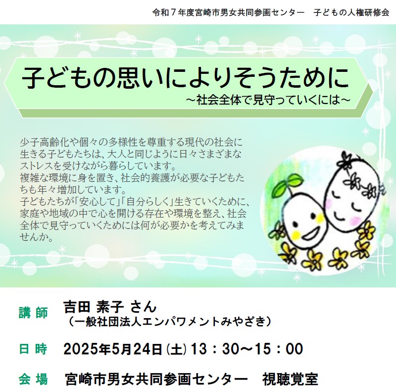 子どもたちの人権が尊重され、「安心して」「自分らしく」生きていくために、家庭や地域の中で心を開ける存在や環境を整え、社会全体で見守っていくには何が必要かを考えるための研修会を開催します。
