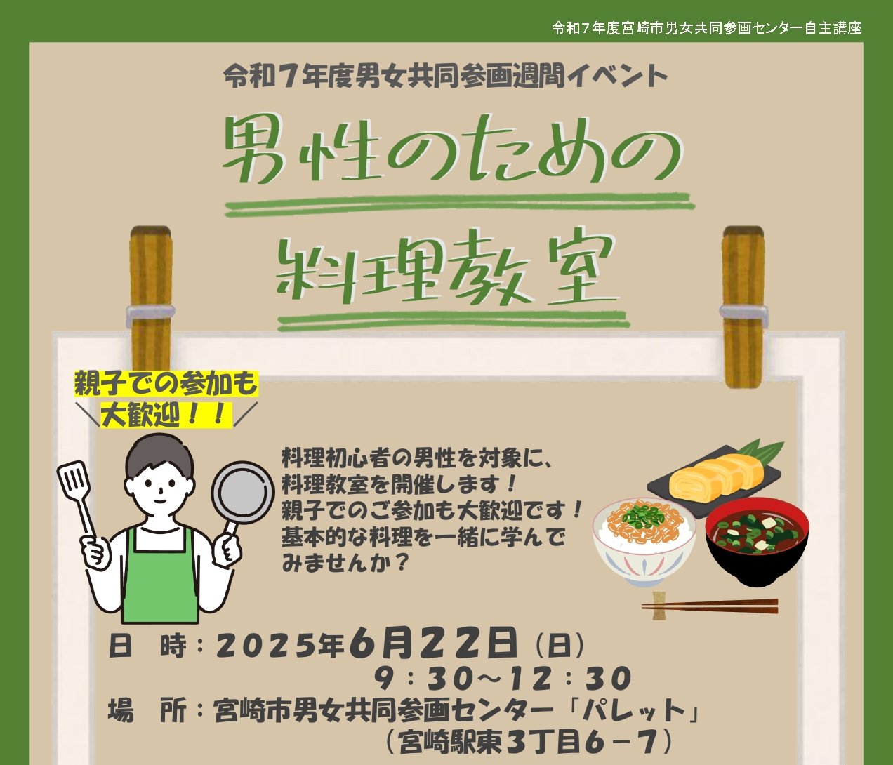 そこで、料理初心者の男性を対象とした料理教室を開催いたします。