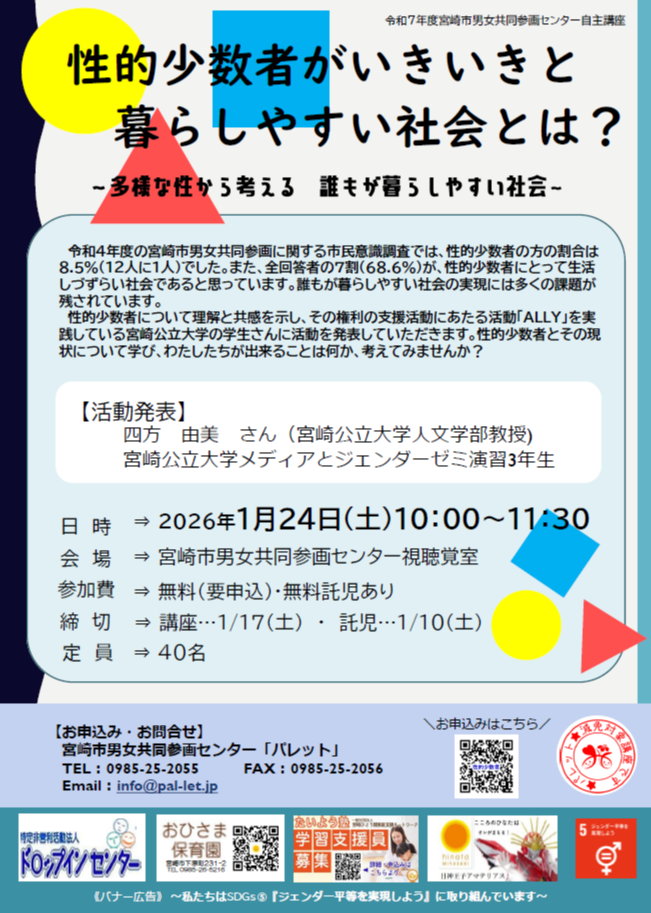 性的少数者について理解と共感を示し寄り添い、その権利の支援活動「ALLY」を実践している宮崎公立大学「メディアとジェンダーゼミ」の学生さんに活動を発表していただきます。